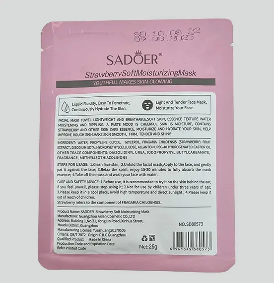 ماسک ورقه ای سادور توت فرنگی برای تمام نواحی صورت بجز اطراف چشم و لب می باشد. ترکیبات این ماسک توت فرنگی از کلاژن تشکیل شده است که باعث ترمیم بافت های پوست شده و آن را نرم و صاف و همچنین ضد چین و چروک بودن آن موجب جوانسازی می شود. ماسک ورقه ای سادور توت فرنگی با آبرسانی عمقی که انجام می دهد.